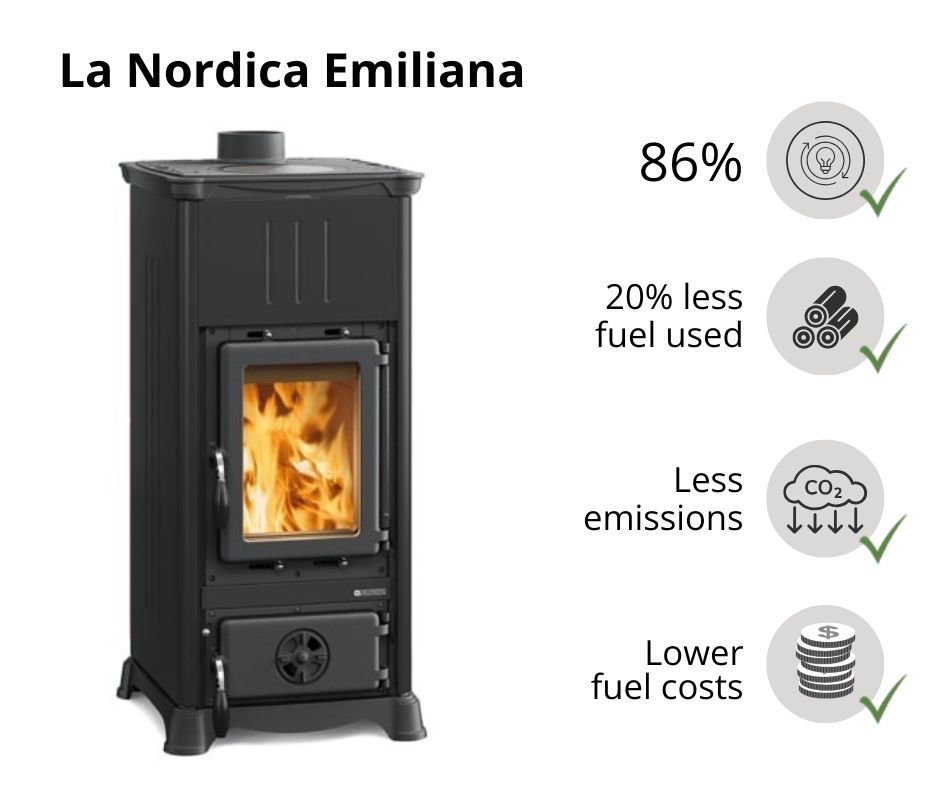 Ιταλική ξυλόσομπα με εστία μαγειρέματος La Nordica Emiliana μαύρο, 6.5kW