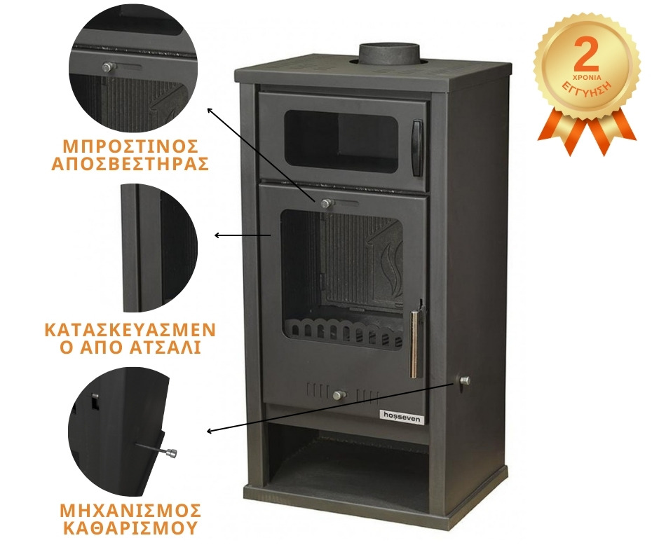 Σόμπα ξύλου με μαντεμένιο θάλαμο καύσης, με φούρνο και αποθηκευτικό χώρο για ξύλα στο κάτω μέρος.